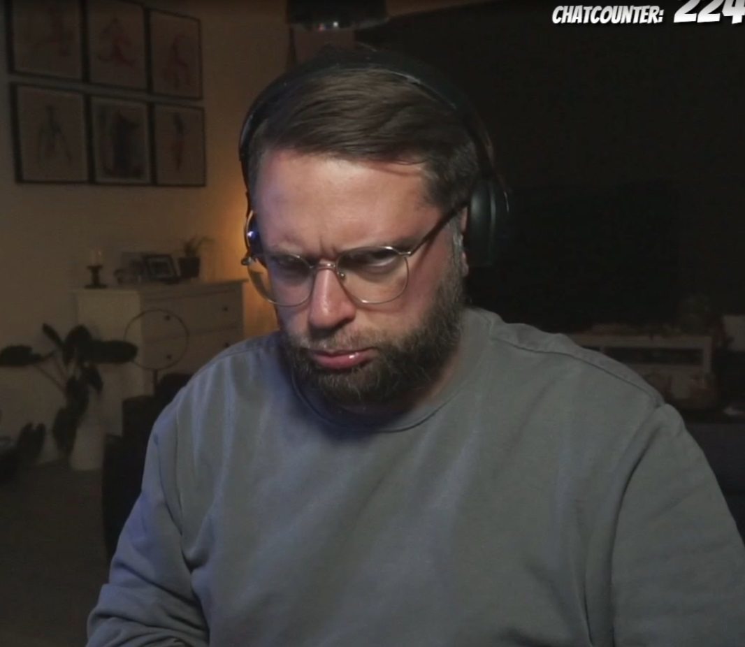 Korpulenter zahnloser Mann mittleren Alters, der sich Müll ansieht.
